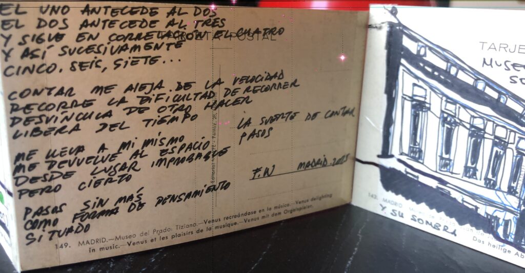 Muévase ahora dentro del museo… determinando y dirigiendo el ritmo de sus pasos: empecemos por la planta 0 de la colección permanente. Deténgase en la primera entrada. Deténgase en la puerta y genere una aglomeración… justo …ahora. Note su propia presencia. Preste más atención a sus movimientos, no mire atrás. Gire ahora o cuando lo crea pertinente. Ponga toda su atención o ninguna atención. Note las fuerzas de atracción y expulsión del museo. Anótelo todo, puede utilizar una tarjeta postal o su diario…almacénelo en su mente para volver a recorrerlo.