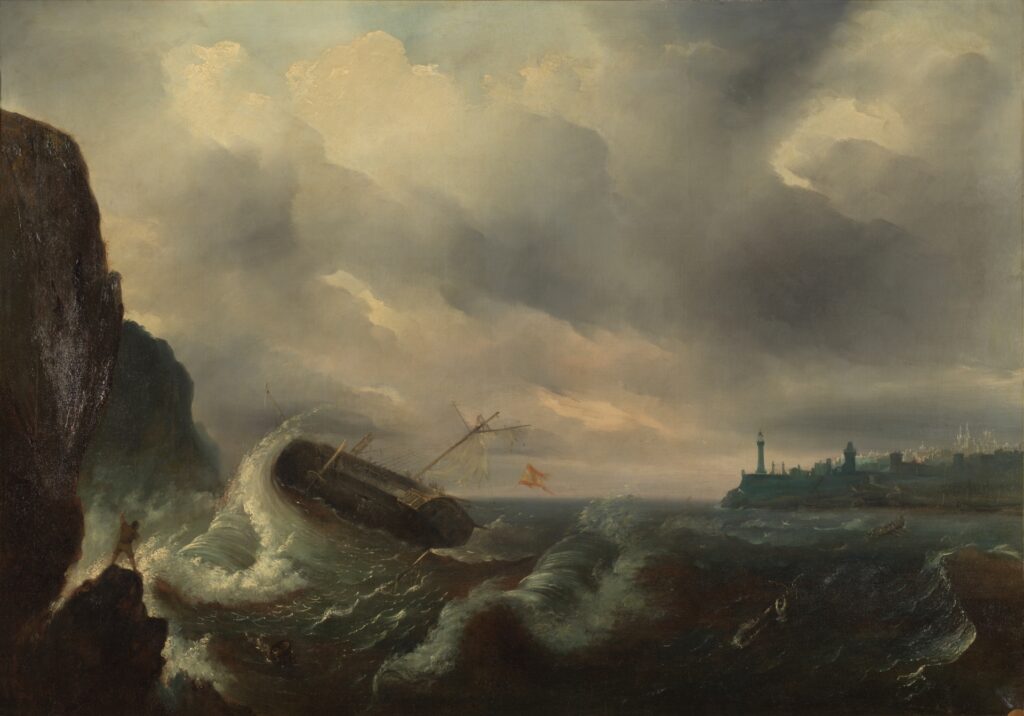 Naufragio de un galeón, de Antonio de Brugada Vila (1841) Fue incautada por la Junta de Incautación y Protección del Tesoro Artístico, con número de inventario 1027. Procedencia señalada como “Adanero (?), col. 122”, etiqueta al reverso. Está incluida en el proyecto “Obras incautadas. Un proceso abierto” junto a otras.